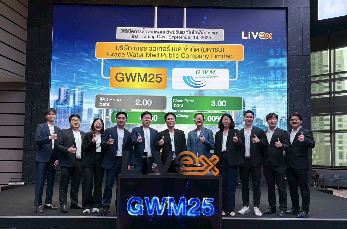 Grace Water Med Public Company Limited (GWM25) made its trading debut on the LiVEx Exchange on Friday, September 19, 2025, attracting keen investor interest. The company was supported in the listing process by Zenon Advisory Limited, serving as its financial advisor.